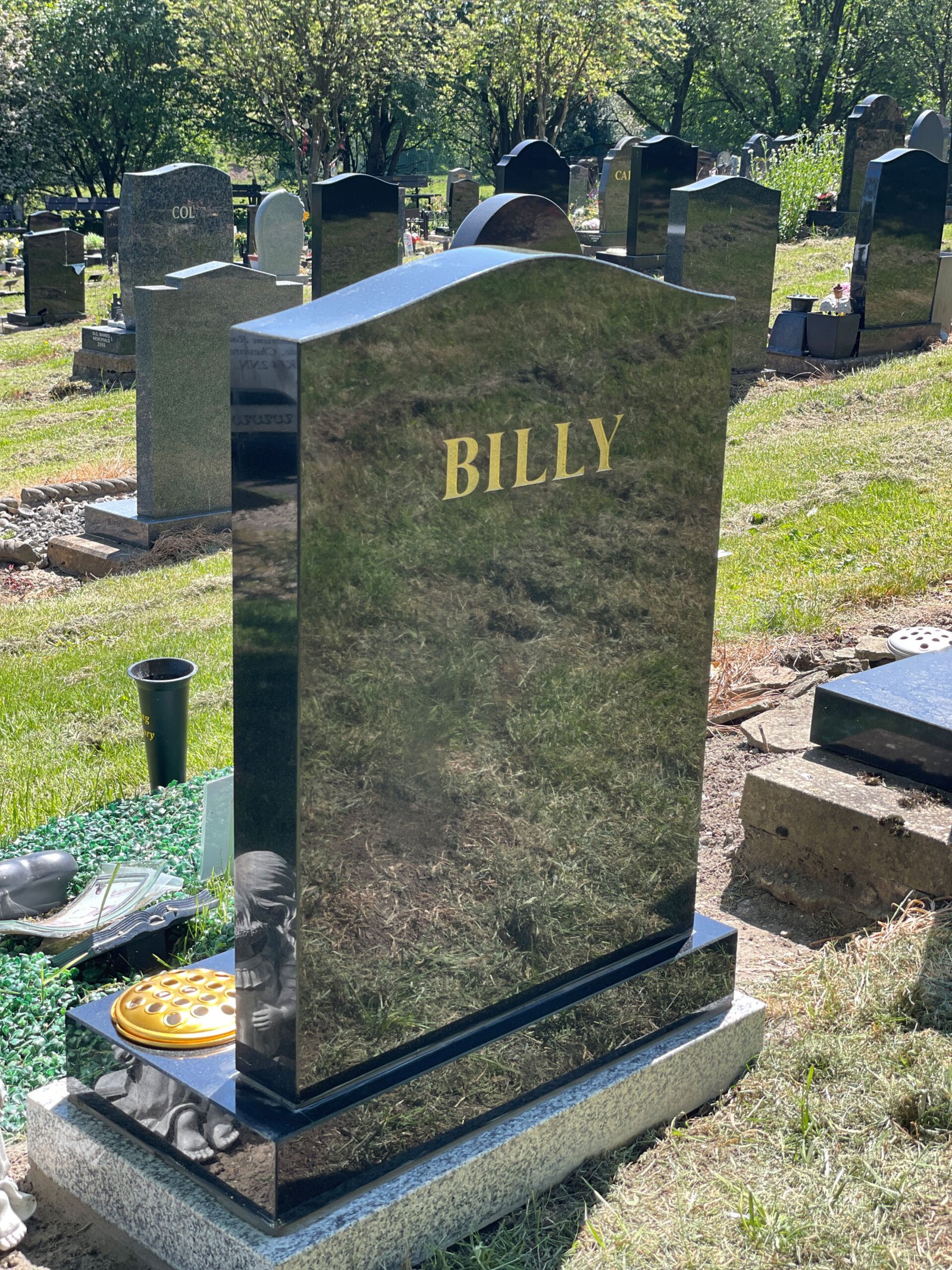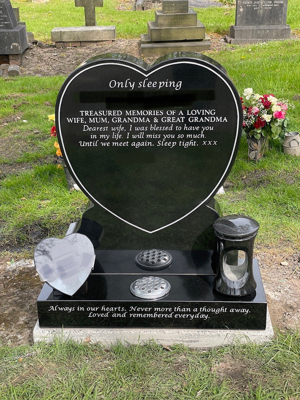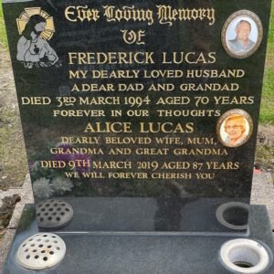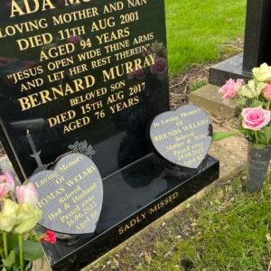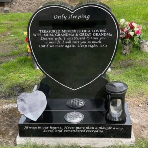 We will help you to choose or design the most suitable headstone, memorial or gravestone, from our large selection of premium quality granite headstones and designs, using the most up to date techniques. We offer extra additions such as grave statues, flower vases and ornaments to add a truly personal touch without going for a fully bespoke memorial design. We also offer a range of modern, shaped memorials such as heart headstones and book headstones.